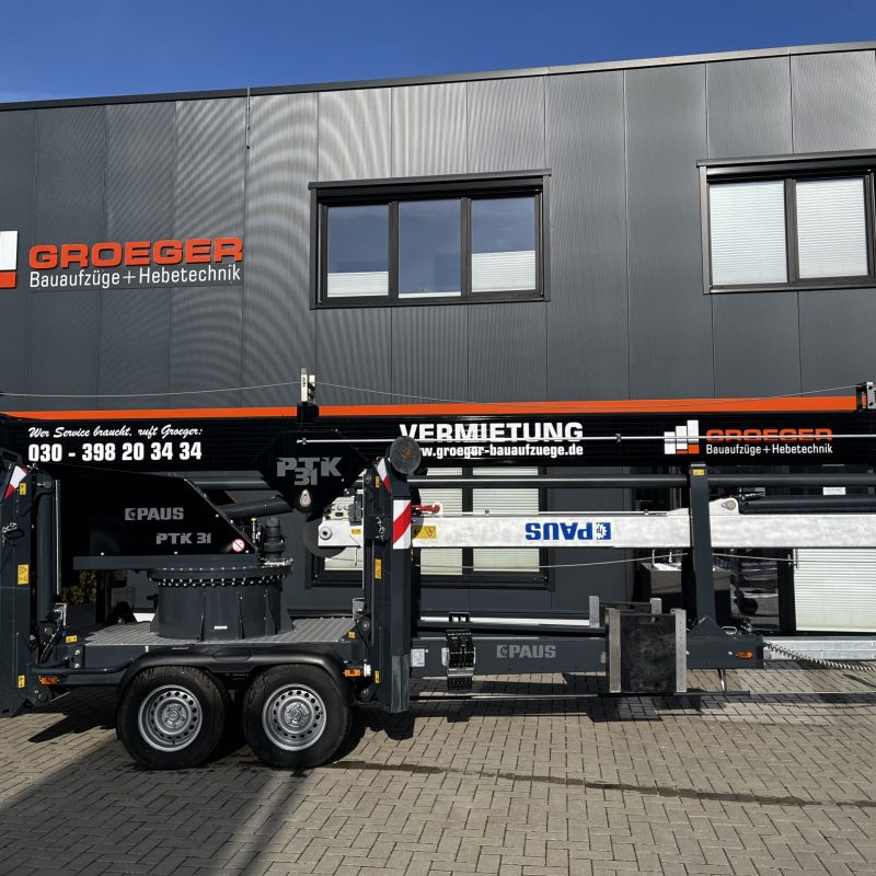 Der PAUS Anhängerkran PTK 31 mit einer Nutzlast von bis zu 1.600 kg, einer max. Ausfahrlänge von 31 m und einer Transportbreite von 1,99 m ist speziell für Dachdecker und Zimmerleute konstruiert. Mit der Verwendung von speziellen Aluminium-Profilen, die ineinander schachtelbar sind, bewältigt der Anhängerkran auch Ihre Transportaufgaben spielend. Vier einzeln klapp- und teleskopierbare Stützen ermöglichen das Aufstellen des Kranes auch auf engem und unebenem Grund wie Treppen oder hohen Bordsteinkanten. Die einschiebbare Deichsel verringert die Aufstellfläche. Ist auch bei schmaler Abstützung und unter Volllast 360° endlos drehbar.