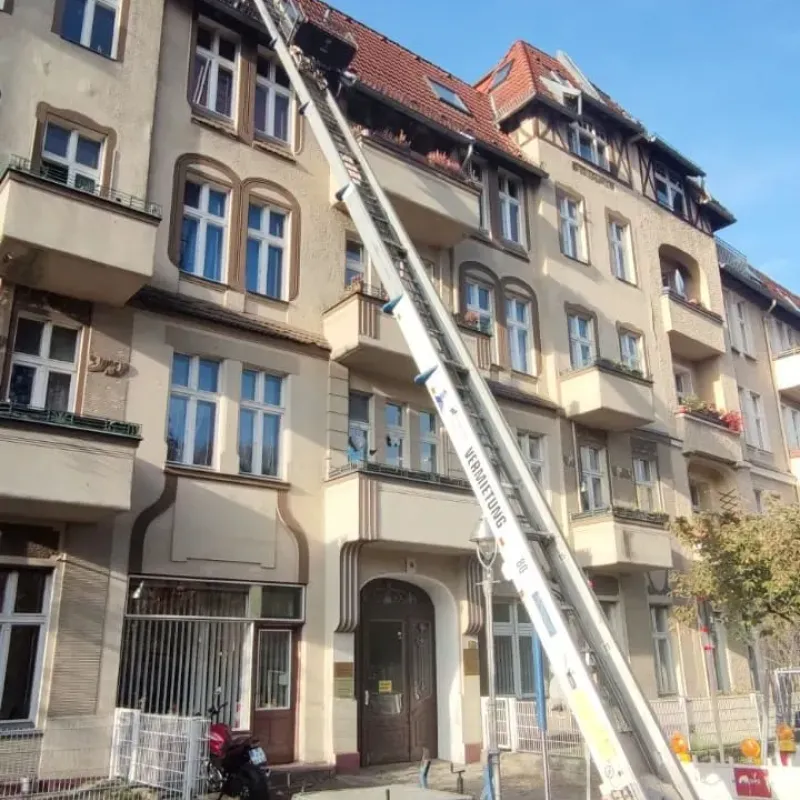 Sicherheitshinweis: Nach Übergabe des Gerätes weisen wir explizit darauf hin, dass der Kunde das Gerät ordnungsgemäß einzusetzen hat, mit täglicher Stützenkontrolle und der Sicherung des Aufzuges mit geeignetem Befestigungsmaterial am Dach gegen Umfallen, insbesondere bei Sturm. Vorsorglich wäre der Abbau des Gerätes durch den Kunden bei Sturmwarnung empfehlenswert (Sorgfaltspflicht). Bei Windgeschwindigkeiten ab 45 m/s (Windstärke 6) ist der Auf- und Abbau verboten. Der Aufzug ist ab 18 Metern mit einem Seil (geführt vom Dach) bei Auf- und Abbau zu führen.