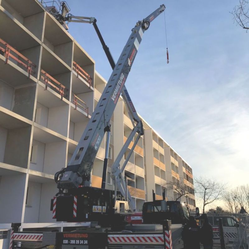 Der K700 überzeugt durch seine kompakten Abmessungen und die große Tragkraft von bis zu 3 Tonnen. Darüber hinaus hat er eine Hakenhöhe von 34,5 m und bietet enorme seitliche Reichweiten – damit können Lasten von 250 kg sogar bis in 30 m Entfernung transportiert werden. Mit der technisch ausgereiften, hydraulisch teleskopierbaren Klappspitze ist er bestens für Arbeiten im städtischen Bereich geeignet und bietet dabei Einsatzmöglichkeiten wie beispielsweise das Verladen oder Entladen verschiedener Materialien. Diese Funktion erleichtert den täglichen Arbeitsablauf von Profis aus den Bereichen Dachdecker, Zimmerer und Fassadenbau.