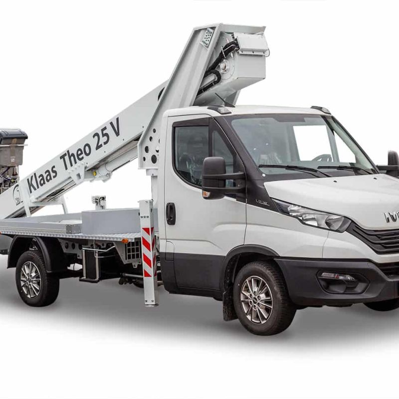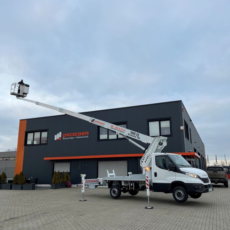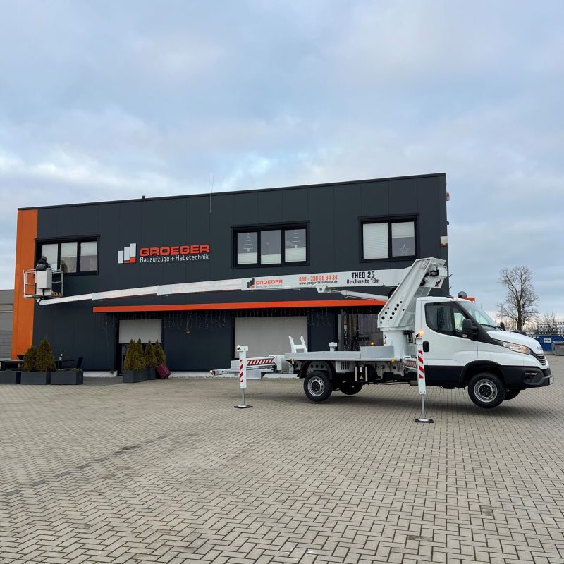 Mit 25 m Arbeitshöhe und über 19 m Reichweite ist der THEO 25V vielseitig einsetzbar – von Dach- und Fassadenarbeiten über Montagen (z. B. Glas) bis hin zu Einsätzen im Industriebau. Auch für Städte und Gemeinden ist er ideal, etwa für Baumschnitt, Gebäudereinigung und Reparaturarbeiten.