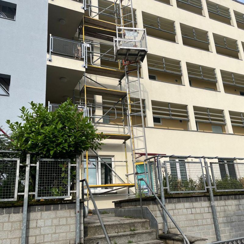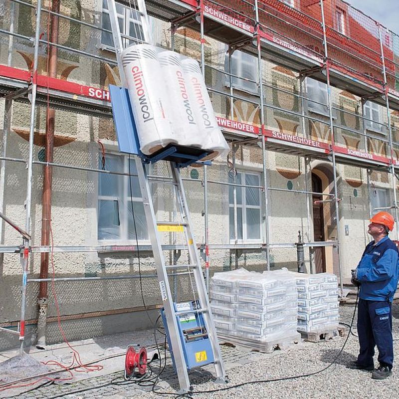 Der Einsatz von Schrägaufzügen überzeugt durch einfache Montage, geringen Zeitaufwand und eine kraftsparende Arbeitsweise. Mit einem verstärkten Leiterprofil können GEDA Schrägaufzüge Nutzlasten von bis zu 250 kg über eine Höhe von 30 m transportieren – Sanierungen an der Außenfassade und im Innenausbau waren noch nie so einfach. Wir empfehlen die Montage über ein Gerüst. Der einstufige Comfortlift ist besonders für geringe Höhen geeignet.
