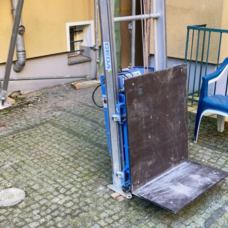 Der Einsatz von Schrägaufzügen überzeugt durch einfache Montage, geringen Zeitaufwand und eine kraftsparende Arbeitsweise. Mit einem verstärkten Leiterprofil können GEDA Schrägaufzüge Nutzlasten von bis zu 250 kg über eine Höhe von 30 m transportieren – Sanierungen an der Außenfassade und im Innenausbau waren noch nie so einfach. Wir empfehlen die Montage über ein Gerüst. Der einstufige Comfortlift ist besonders für geringe Höhen geeignet.