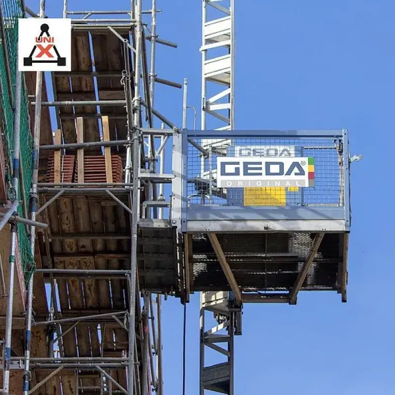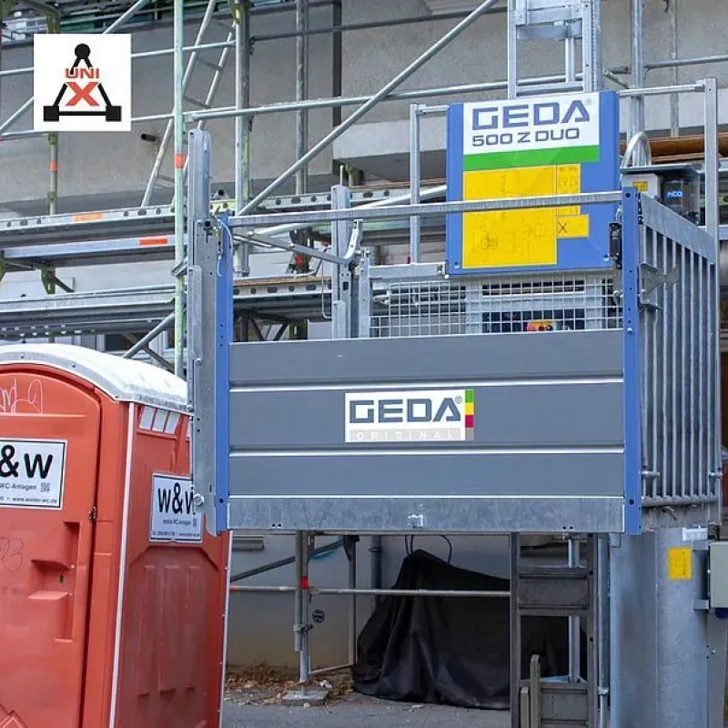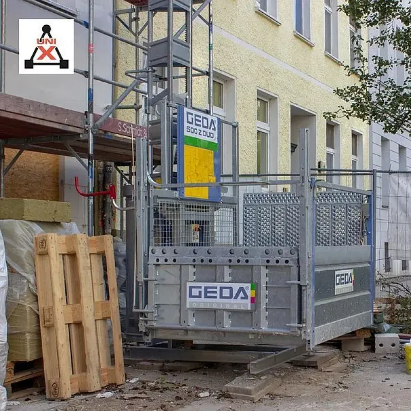 Der GEDA 500 Z DUO überzeugt mit seinem einzigartigen Feature mit dem er sich vom 500 Z unterscheidet: er kann sowohl als Durchfahrbühne als auch als Schwenkbühne genutzt werden, sodass er sich ganz individuell an die Gegebenheiten am Einsatzort anpassen lässt. Mit einer Lastbühne, die bis zu 500 kg tragen kann, ist der Materialtransport auf der Baustelle kein Problem mehr. Der um 90 Grad schwenkbare Fahrkorb ermöglicht ein komfortables Be- und Entladen mit hoher Sicherheit in jeder Etage. Die Bodenstation bietet Platzersparnis dank paralleler Beladung. Als Zubehör steht zudem ein patentierter Einachsanhänger, für den Transport und automatischen Absetzen bzw. Aufladen des Aufzugs bereit.